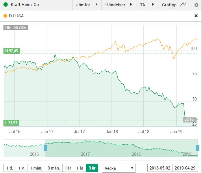 Beträffande KHC är bolaget just nu mycket intressant och jag är fortfarande kluven till om jag skall ta en position. För cirka ett sex månader sedan skrev jag denna analys och sedan dess har det gått mer utför än uppför för bolaget. Den senaste rapporten, från 21 april, ger få anledningar till leende. Försäljningstillväxten var enbart 1 % och en VPA på - 10,34 %. Som om detta ej vore nog skrevs värdet på märkena/produkterna ned med hiskliga 15 miljarder USD och därtill sänktes utdelningen med 36 %, vilket ändå måste betraktas, givet situationen, som bra och sunt av ledningen. Marknaden straffade aktien med en nedgång på lite mer än 27 % på rapportdagen.